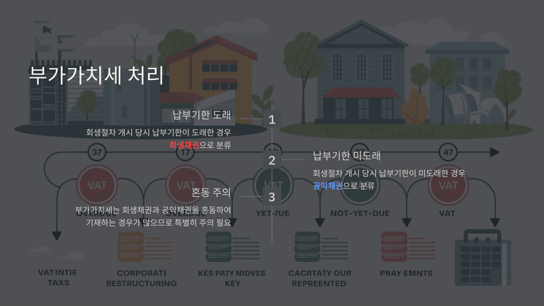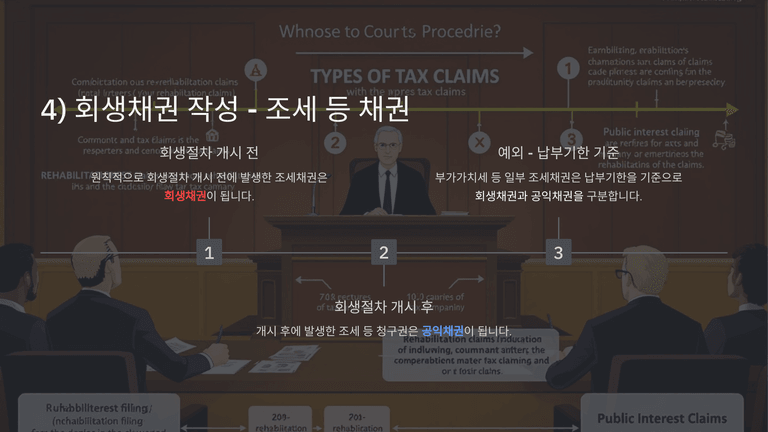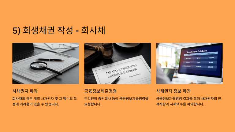 조세채권은 발생시기와 납부기한 등을 기준으로 회생채권과 공익채권을 구분해야 하며, 부가가치세의 경우 특히 주의를 요한다. 회사채의 경우 개별 사채권자 식별이 어려울 수 있어 금융정보제출명령 등을 통해 정보를 확보한다.