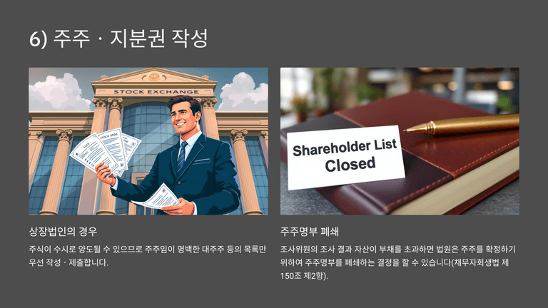 주주·지분권자 목록은 상장법인의 경우 대주주 등 명확한 자만 일단 기재하고, 이후 조사결과에 따라 법원이 주주명부를 폐쇄하면 다른 주주는 보완신고를 통해 권리를 주장할 수 있다.