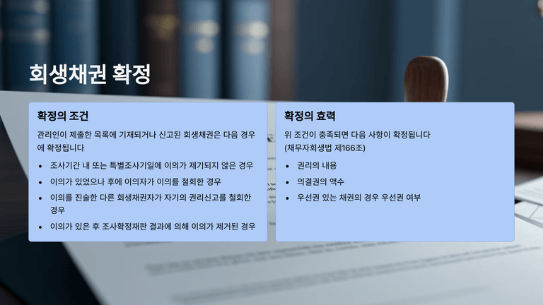 회생채권 등은 관리인이 제출한 목록에 기재되거나 채권자가 신고한 경우, 이의가 없거나 이의가 철회되거나, 이의가 제거된 경우에 그 권리 내용과 의결권의 액수, 우선권의 유무가 확정된다(채무자회생법 제166조). 이의가 있는 경우, 해당 채권자는 이의자 전원을 상대로 채권조사확정재판을 신청해야 하며, 이는 간이하고 신속한 절차로 진행된다(제170조).