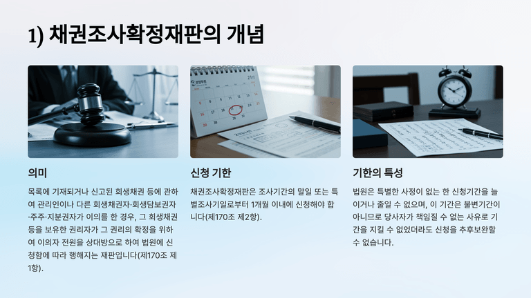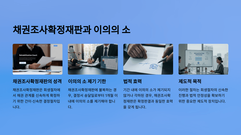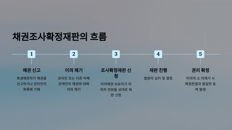 이 재판은 조사기간 말일 또는 특별조사기일로부터 1개월 이내에 신청해야 하고, 이는 법원이 임의로 변경할 수 없는 기간이다. 해당 기한 내 신청이 없거나 철회되면, 채권은 이의 내용대로 부인된 것으로 절차상 확정된다. 단, 시효중단 효력은 유지되며, 회생절차가 폐지되면 권리를 다시 행사할 수 있다.