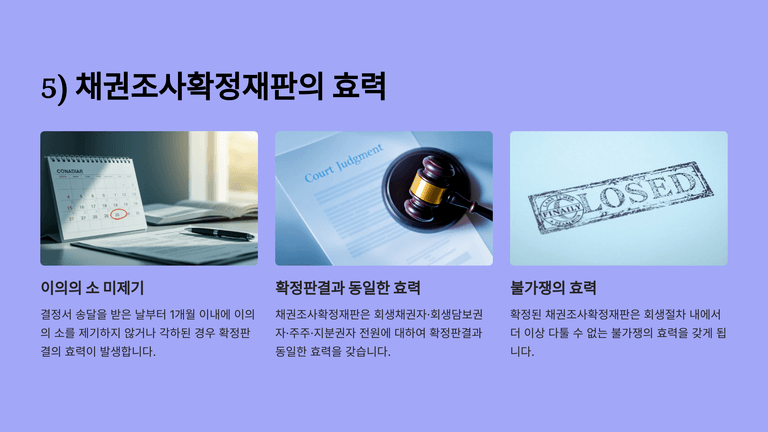 채권조사확정재판에 대한 이의의 소가 제기되지 않거나 각하된 경우, 해당 재판은 회생채권자 등 전원에 대해 확정판결과 동일한 불가쟁력이 있다(제176조 제2항). 이는 회생절차 내에서만 효력이 있는 내부적 확정력을 의미한다.