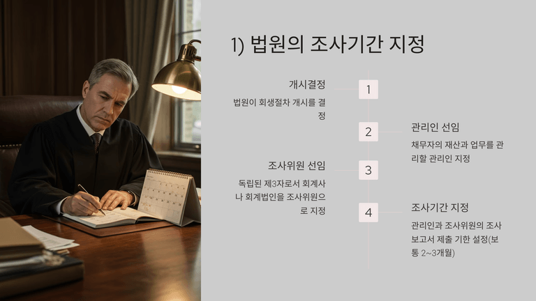 법원은 회생절차 개시결정과 동시에 관리인과 조사위원을 선임하고, 조사기간을 정하여 양자에게 채무자의 재산, 경영, 회생 가능성 등을 조사하여 보고하도록 명한다. 관리인은 개시 당시 재산 목록과 재무제표를 작성하고, 회생 사유 등 법정 사항을 조사하여 보고해야 한다.