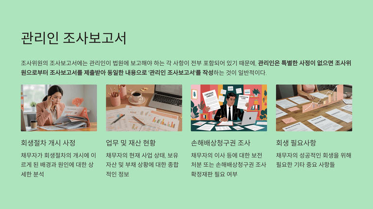 실무상 조사보고서 제출기한은 개시결정일부터 2~3개월 이내로 정해지고, 관리인은 보통 조사위원 보고서를 기초로 자신의 보고서를 작성한다. 관리인은 조사위원에게 성실하게 자료를 제출하고 협조해야 하며, 조사위원 보고서가 부정적일 경우 M&A나 외부자금 조달 등 회생 가능성을 입증하지 못하면 회생절차는 폐지될 수 있다.