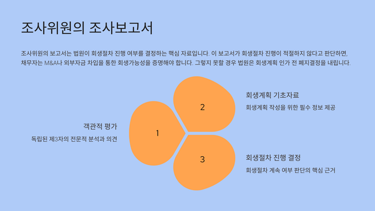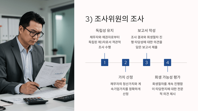 조사위원(보통 회계법인)은 관리인과 동일한 범위의 조사를 수행하되, 추가로 청산가치·계속기업가치를 산정하고 회생절차 계속 여부에 대한 의견을 포함한 제1차 조사보고서를 제출한다. 이 보고서는 회생계획 작성의 기초자료이며, 회생절차 계속 여부 판단의 핵심 근거가 된다.