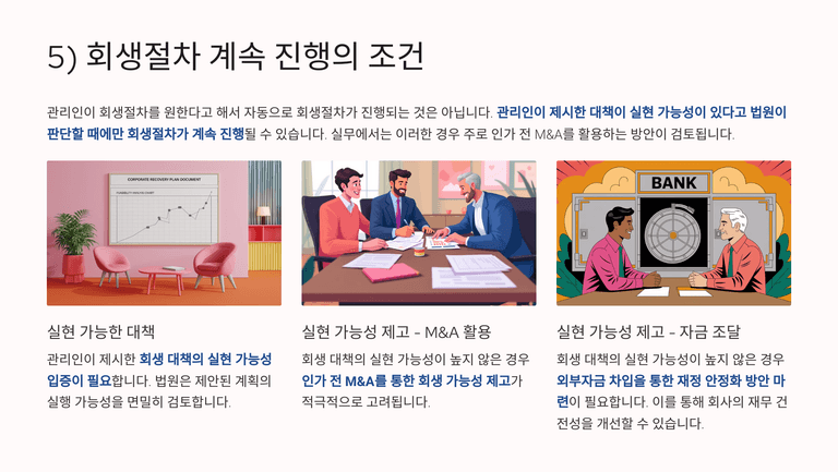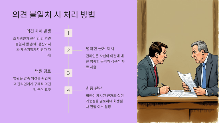 관리인이 조사위원과 다른 의견을 제출하는 경우에는 명확한 근거를 제시해야 하며, 법원은 양측 의견을 비교하여 회생절차 진행 여부를 판단한다. 이 경우 관리인의 대책이 실현 가능성이 있다고 인정되면 절차를 계속할 수 있고, 일반적으로는 인가 전 M&A 방식이 활용된다.