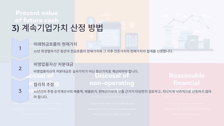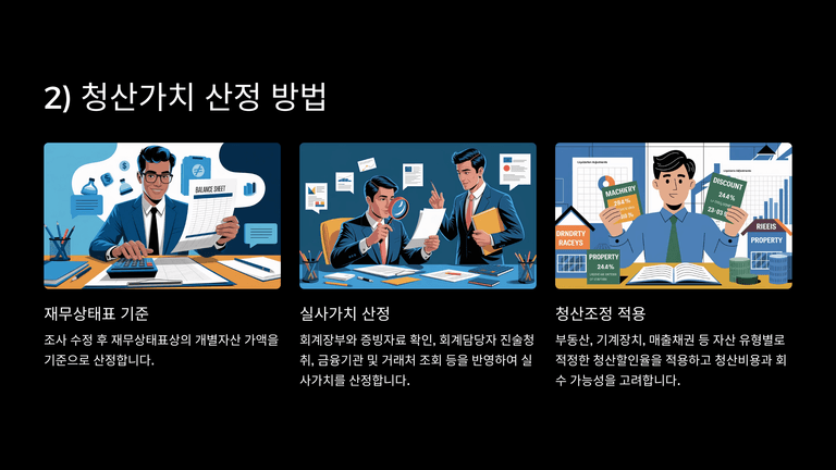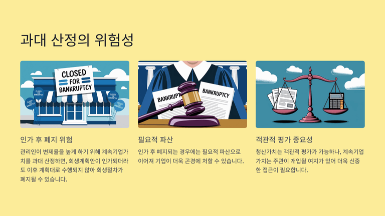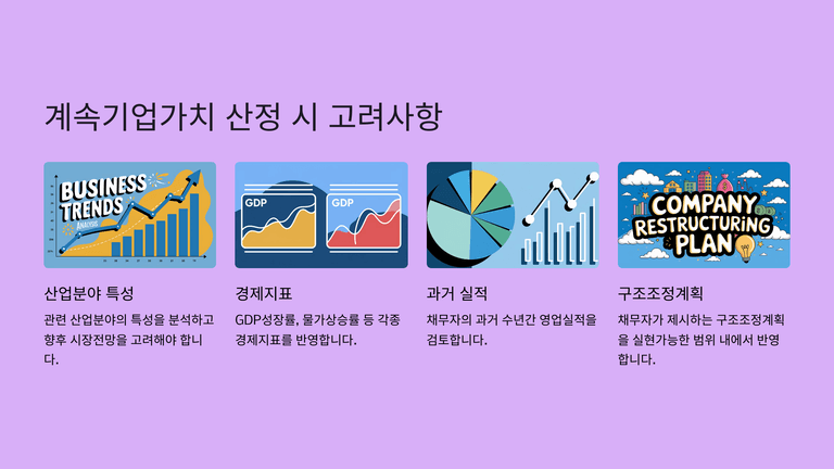 청산가치는 자산별로 실사가격에 청산조정을 적용하여 계산되며, 자산별로 경매낙찰가율이나 할인율 등을 반영한다. 계속기업가치는 추정 손익계산서를 기반으로 한 미래현금흐름의 현재가치와 비영업용자산의 청산가치 등을 합산하여 산정한다. 이때 산업 전망, 경제지표, 과거 실적, 구조조정 계획 등을 충분히 고려해야 하며, 낙관적인 추정을 경계해야 한다.