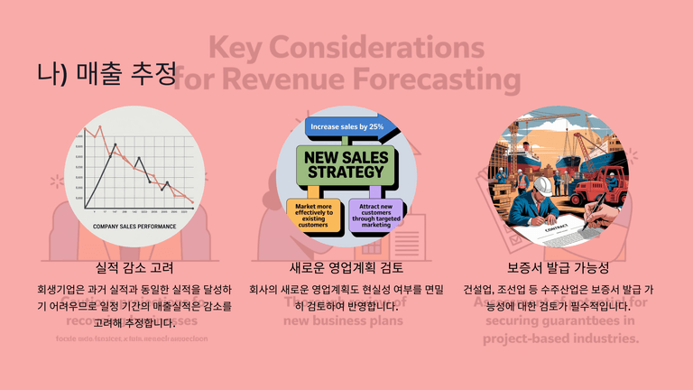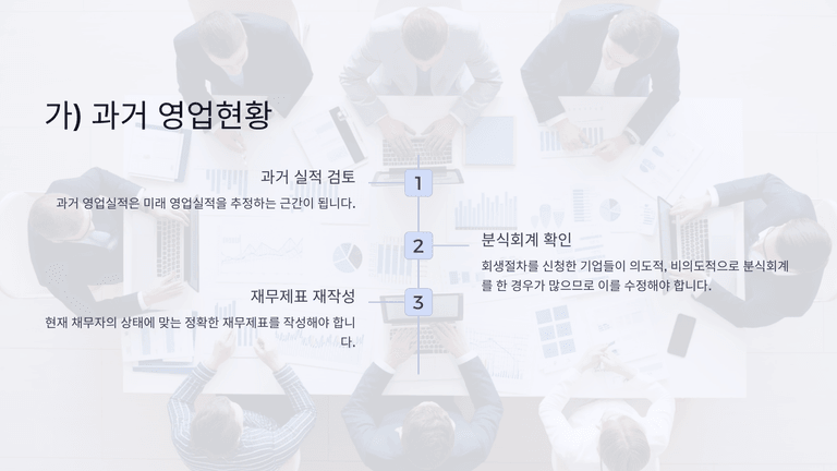 과거 영업실적은 미래 추정의 기초가 되며, 분식회계 가능성이 있다면 이를 수정한 재무제표를 작성해야 한다. 매출 추정은 과거 실적을 바탕으로 하되, 회생기업의 특성을 고려해 감액하고, 새로운 사업계획도 현실성 있게 반영해야 한다. 특히 수주산업의 경우 향후 보증서 발급 가능성 검토가 필수적이다.