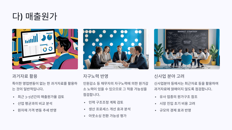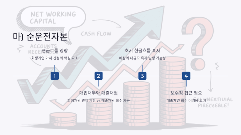 매출원가와 판관비는 과거자료를 기준으로 하되, 자구노력이나 영업 변화가 있는 경우 그 영향을 반영해야 한다. 특히 경비 축소가 타당한지 검토해야 한다. 순운전자본은 회생 초기에 현금흐름에 큰 영향을 미칠 수 있으므로, 매출채권 회수 가능성을 신중히 분석하고 보수적으로 접근할 필요가 있다.