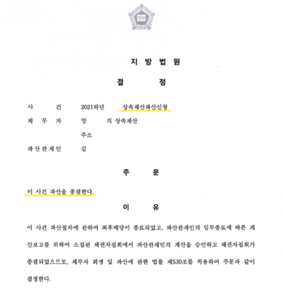 의뢰인 역시 파산관재인이 모든 망인의 채무에 대해 파산을 종결해드림으로써 상속 문제를 말끔하게 해결하였습니다.