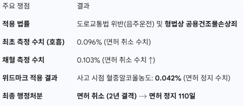 행정 처분 감경 성공: 채혈 수치 0.103%로 확정될 뻔했던 면허 취소 (2년 결격) 처분이 면허 정지 110일 처분으로 대폭 감경되었습니다.