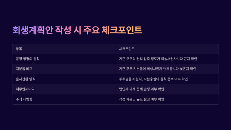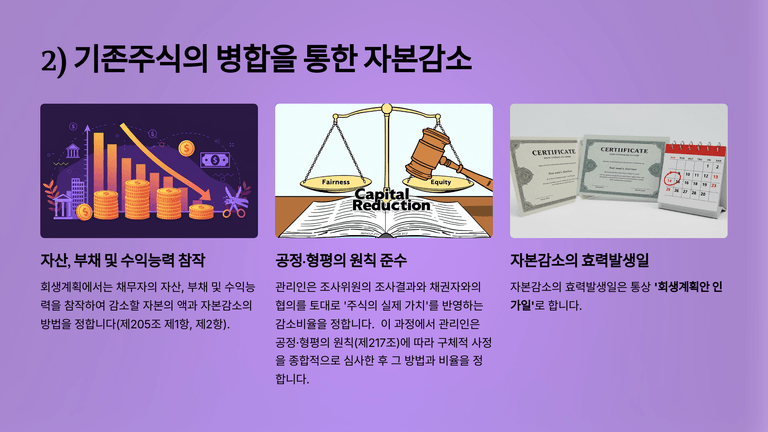 출자전환 후 자본금이 과도하게 커지는 것을 방지하기 위해 전체 주식에 대해 다시 주식 재병합을 실시하며, 그 효력은 신주발행일 다음 날로 한다. 회생절차 중에는 상법상의 주주총회 등 결의 없이도 자본감소·증자 등이 가능하며, 주주권의 제한과 신주발행 요건 등을 회생계획안에 명시적으로 규정할 필요가 있다. 특히 M&A 등 외부 자금유입 목적의 신주발행에는 법 제206조의 기재사항 충족 여부를 확인해야 한다.