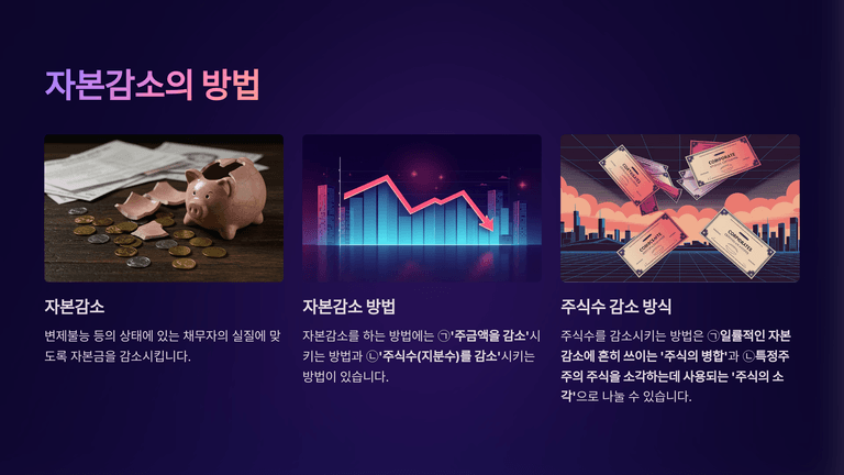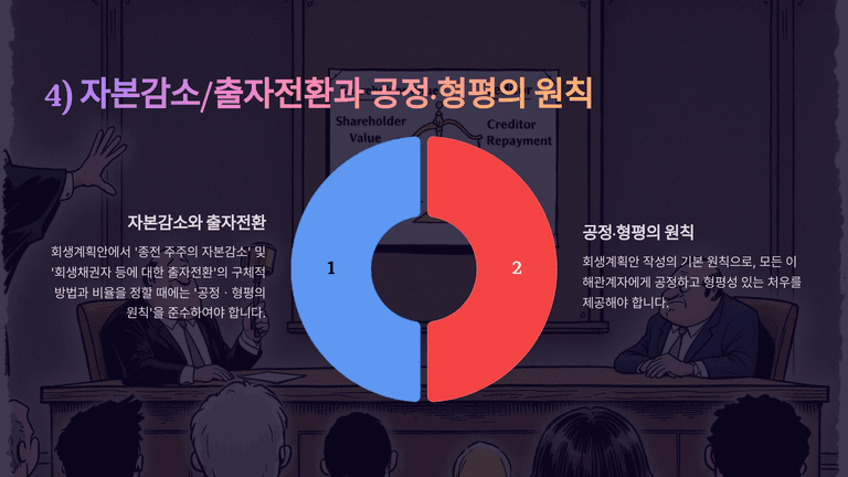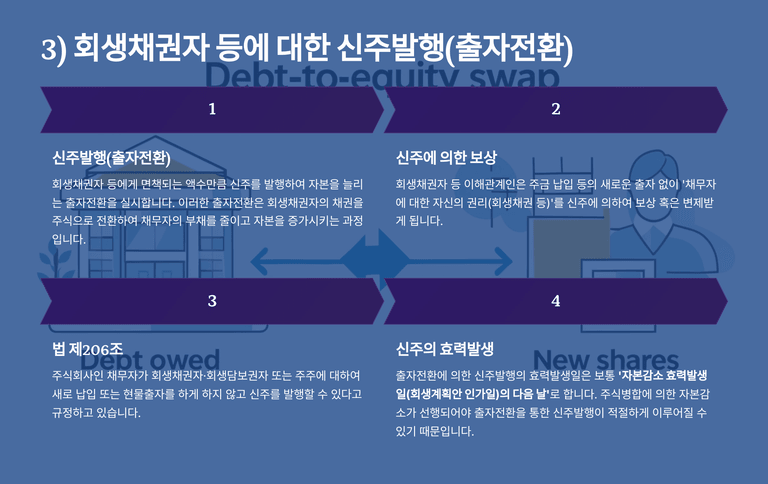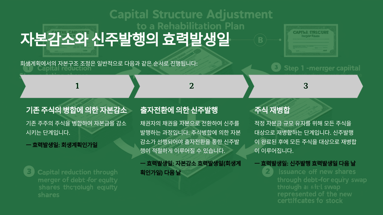 회생계획에서는 채무자의 부채를 줄이고 자본을 정비하기 위해 먼저 주식병합이나 소각을 통한 자본감소를 실시한다. 이는 공정·형평 원칙에 따라 기존 주주의 지분을 축소하고, 실질가치를 반영한 감자비율을 설정하는 방식으로 진행된다. 이후 회생채권자 등에 대해 신주를 발행하여 채권을 출자전환하는 방식으로 자본을 증가시키며, 통상 자본감소는 인가일, 신주발행은 그 다음 날을 효력발생일로 설정한다.