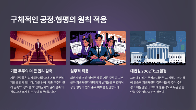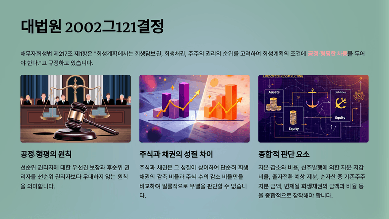 회생계획에서 기존 주주의 지분율은 회생채권자의 변제율보다 낮아야 하며, 기존 주주의 권리 감축은 회생채권자보다 더 커야 공정한 것으로 평가된다. 그러나 단순 비교는 곤란하므로 자본감소율, 신주발행 후 지분율, 순자산 분배, 출자전환 가능성, 보증채무 변제 전망 등 다양한 요소를 종합적으로 고려해야 한다는 대법원 판례(2002그121)가 있다. 또한 책임 있는 경영진이나 대주주의 지분은 보다 높은 비율로 감자할 수 있다.