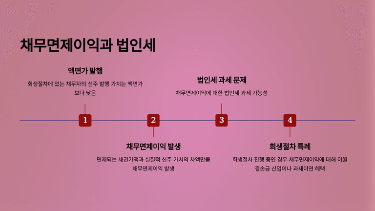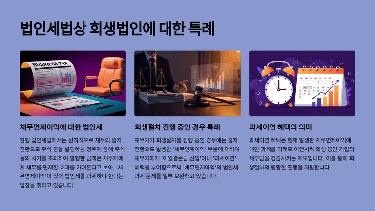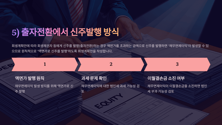 출자전환 시 액면가로 신주를 발행하는 것이 원칙이지만, 실질적으로는 주식 가치가 액면가보다 낮은 경우가 많아 채무자에게 '채무면제이익'이 발생하고, 이에 대한 법인세 과세 문제가 생길 수 있다. 다만 회생절차 중에는 이월결손금 활용이나 과세이연 등으로 조세 부담이 일정 부분 완화된다.