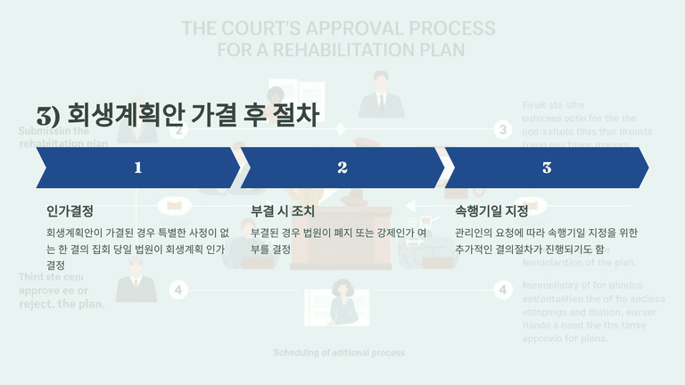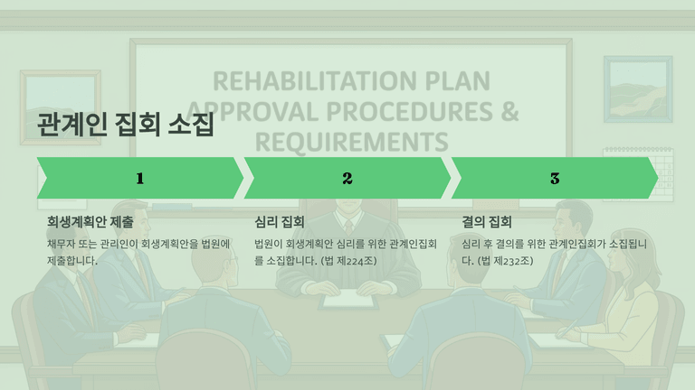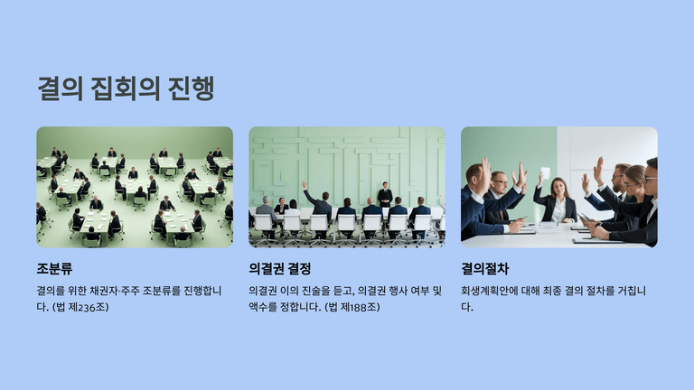심리 집회에서는 관리인의 계획안 설명, 조사위원의 검토 의견, 채권자 등 이해관계인의 의견진술 순으로 심리가 이루어진다. 이어지는 결의 집회에서는 조 분류, 의결권 인정 여부 결정, 그리고 회생계획안 결의가 진행된다.