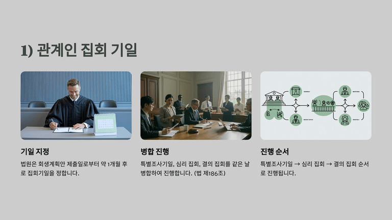 회생계획안 제출 시 법원은 심리를 위한 관계인집회와 결의를 위한 관계인집회를 소집하며, 신속한 진행을 위해 특별조사기일과 함께 병합하여 같은 날 진행하는 것이 일반적이다. 집회기일은 제출일로부터 약 1개월 뒤로 정해지며, 특별조사기일 후 심리 집회, 결의 집회의 순서로 진행된다.
