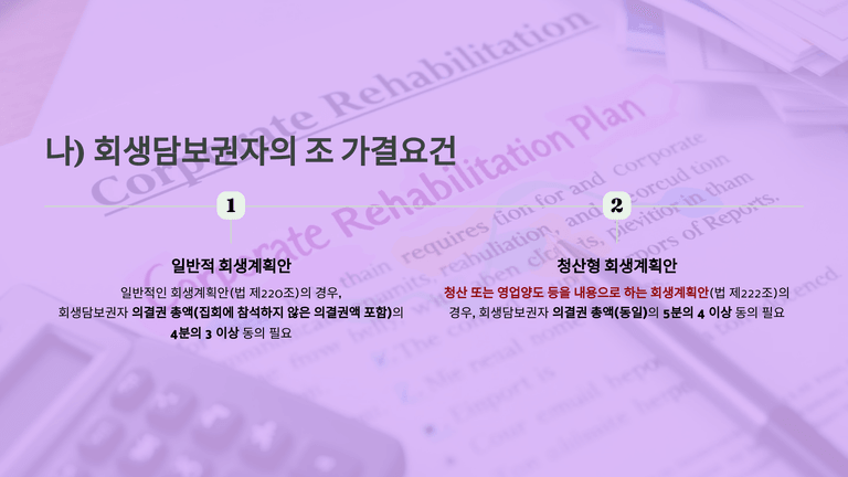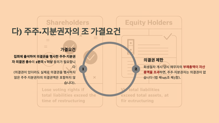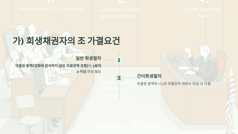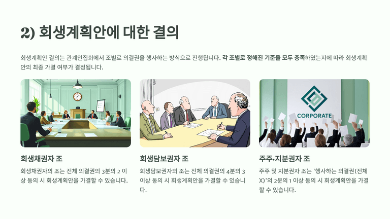 회생계획안은 회생채권자, 회생담보권자, 주주·지분권자의 조별 동의 요건을 충족해야 가결된다. 회생채권자는 의결권 총액의 3분의 2 이상, 회생담보권자는 4분의 3 또는 청산형의 경우 5분의 4 이상, 주주·지분권자는 참석자 기준 의결권의 2분의 1 이상이 필요하다. 부채총액이 자산총액을 초과하는 경우 주주는 의결권을 행사하지 못한다.