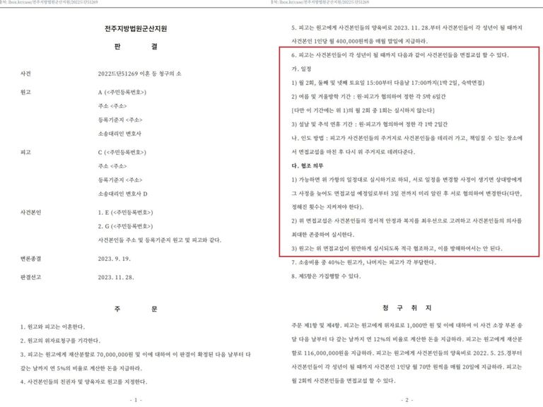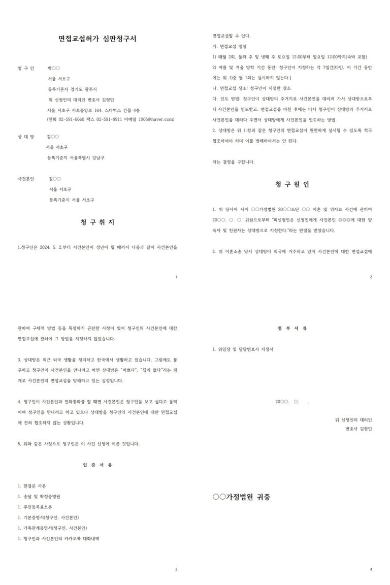 이혼소송을 제기하여 사건본인에 대한 양육자 및 친권자를 상대방으로 지정하였으나 면접교섭에 관한 구체적인 내용을 정하지 않았을 때가 있을 것입니다.