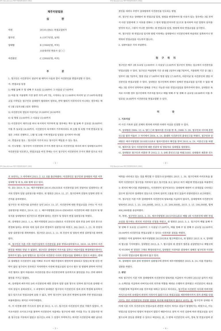 자. 한편, 청구인은 2015. 2, 23. 제주지방법원 2015즈단16호로 매월 1회 사건본인에 대한 면접 교섭을 청구하는 취지의 사전처분 신청을 하였고, 위 법원은 2015. 5. 1. 청구인이 매월 둘째 주 및 넷째 주 토요일 12:00부터 그 다음날 17:00까지, 매월 첫째 주 및 셋째 주 금요일 18:00부터 20:00까지 사건본인을 면접교섭할 수 있다는 사전처분 결정을 하였다.