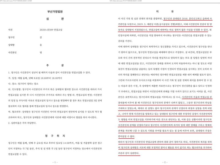 [청구인과 상대방의 이혼소송에서 상대방에 대하여 공시송달로 진행되었고 사건본인의 친권자 및 양육자를 상대방을 지정하였으나 면접교섭에 관하여 정하지 않아 청구인이 면접교섭허가심판을 제기하여 인용받은 사례 : 부산가정법원 2021. 1. 19.자 2020느단309 면접교섭]