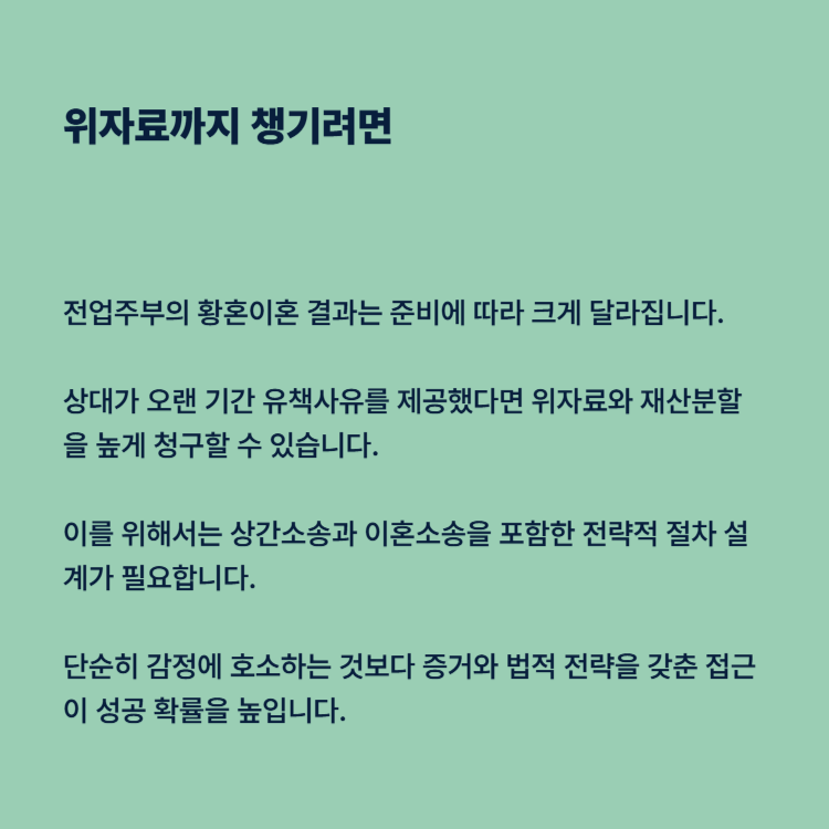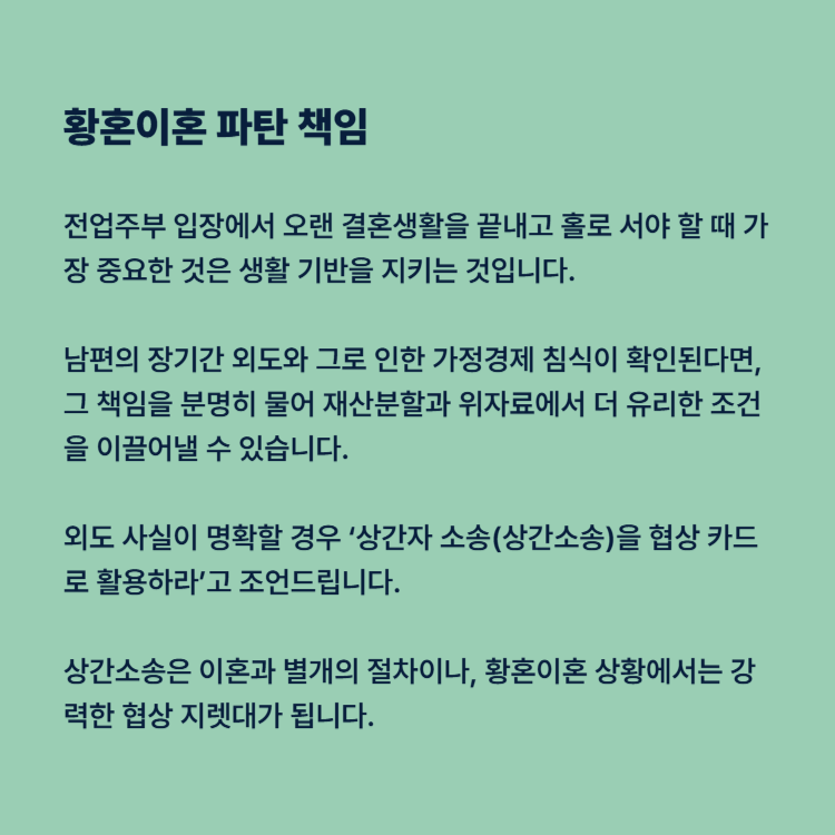 전업주부 입장에서 오랜 결혼생활을 끝내고 홀로 서야 할 때 가장 중요한 것은 생활 기반을 지키는 것입니다. 남편의 장기간 외도와 그로 인한 가정경제 침식이 확인된다면, 그 책임을 분명히 물어 재산분할과 위자료에서 더 유리한 조건을 이끌어낼 수 있습니다.