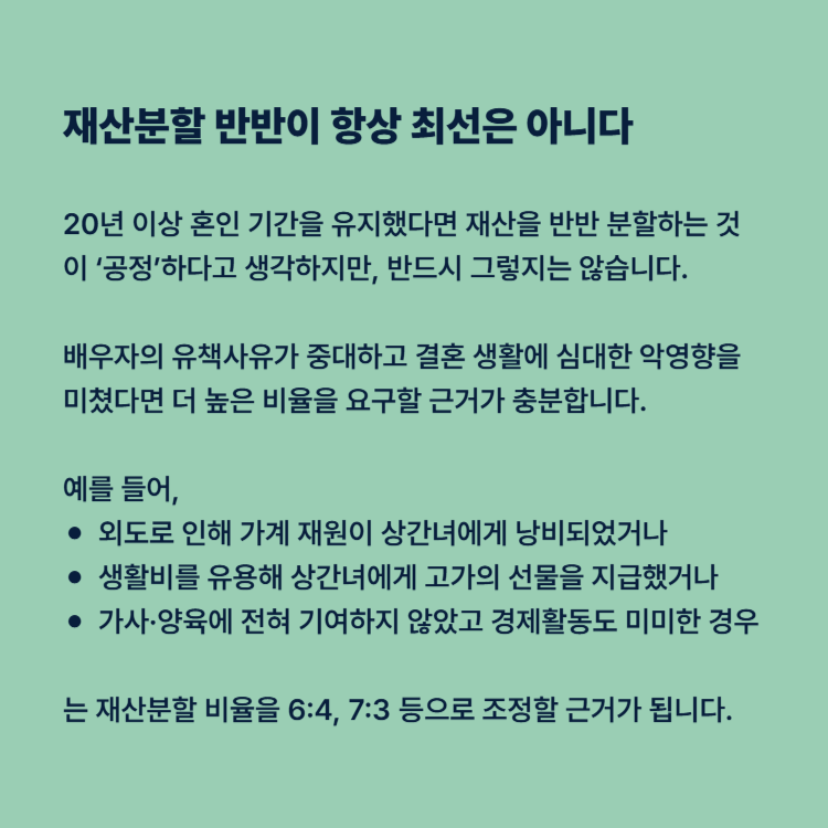 20년 이상 혼인 기간을 유지했다면 흔히 5:5로 분할하는 것이 ‘공정’하다고 생각하지만, 반드시 그렇지는 않습니다. 배우자의 유책사유가 중대하고 결혼 생활에 심대한 악영향을 미쳤다면 더 높은 비율을 요구할 근거가 충분합니다.