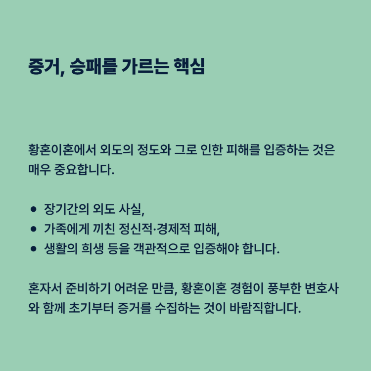 황혼이혼에서 외도의 정도와 그로 인한 피해를 입증하는 것은 매우 중요합니다. 장기간의 외도 사실, 가족에게 끼친 정신적·경제적 피해, 생활의 희생 등을 객관적으로 입증해야 합니다. 혼자서 준비하기 어려운 만큼, 황혼이혼 경험이 풍부한 변호사와 함께 초기부터 증거를 수집하는 것이 바람직합니다.