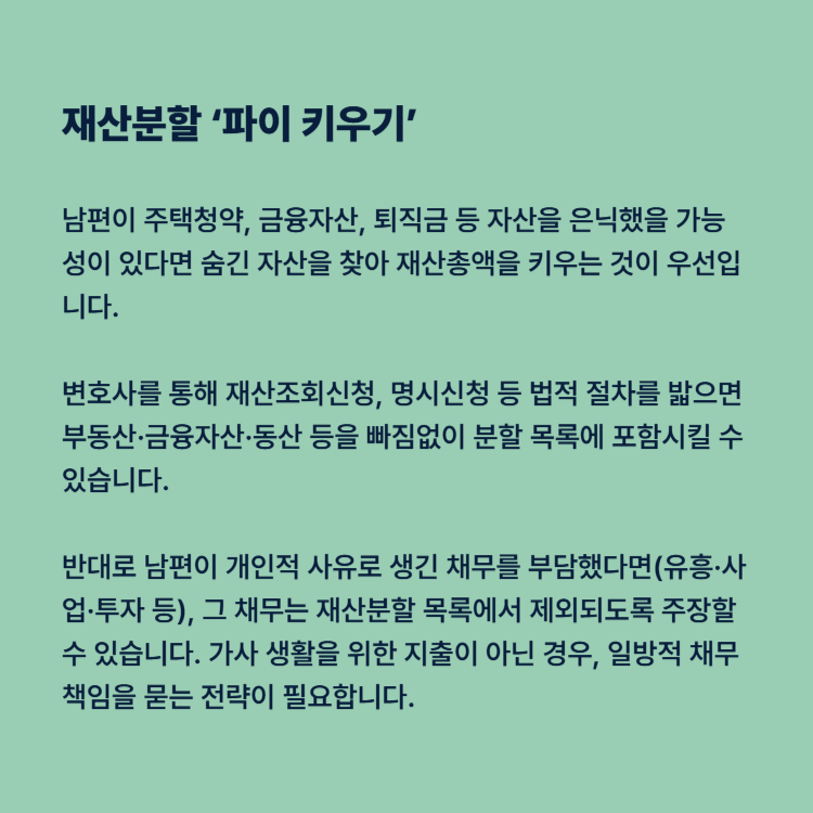 반대로 남편이 개인적 사유로 생긴 채무를 부담했다면(유흥·사업·투자 등), 그 채무는 재산분할 목록에서 제외되도록 주장할 수 있습니다. 가사 생활을 위한 지출이 아닌 경우, 일방적 채무 책임을 묻는 전략이 필요합니다.