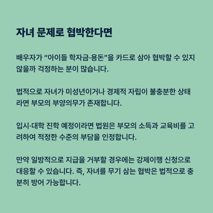 배우자가 “아이들 학자금·용돈”을 카드로 삼아 협박할 수 있지 않을까 걱정하는 분이 많습니다. 법적으로 자녀가 미성년이거나 경제적 자립이 불충분한 상태라면 부모의 부양의무가 존재합니다. 입시·대학 진학 예정이라면 법원은 부모의 소득과 교육비를 고려하여 적정한 수준의 부담을 인정합니다. 만약 일방적으로 지급을 거부할 경우에는 강제이행 신청으로 대응할 수 있습니다. 즉, 자녀를 무기 삼는 협박은 법적으로 충분히 방어 가능합니다.
