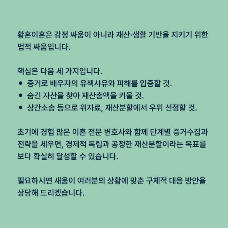 이혼소송은 감정의 싸움이 아니라 그간의 시간과 노력을 ‘가치’로 환산해내는 과정입니다. 지금부터라도 전문가와 함께 당신의 권리를 수치로, 문서로, 법적 결과로 증명해 나가야 합니다. 이혼은 끝이 아니라 ‘새로운 삶의 시작’을 위한 준비이기도 합니다. 그 첫걸음은 정확한 재산분석과 전략적 협상에서 시작됩니다.