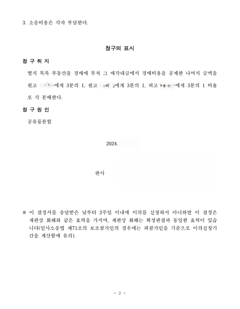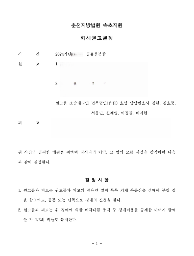 저는 즉각 공유물분할청구소송을 제기하여 제반사정 등에 비추어 경매분할이 가장 적합한 방법이라는 점을 주장 입증하였고 법원은 경매분할을 명하는 화해권고결정을 내려 확정되었습니다.