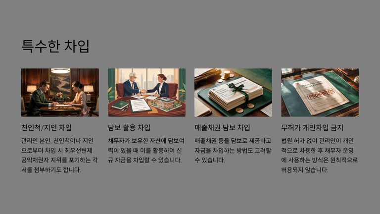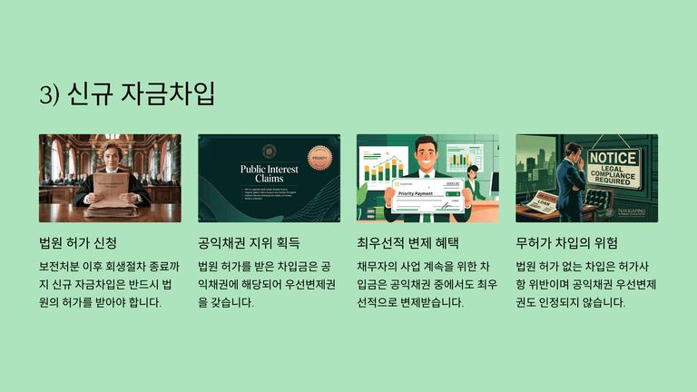 신규 자금차입은 회생절차 진행 중 반드시 법원의 허가를 받아야 하며, 어음할인 방식도 동일하게 적용된다. 법원의 허가를 받아 차입한 자금은 공익채권으로서 최우선적으로 변제받을 수 있으므로 운영자금 확보에 효과적이다. 그러나 법원 허가가 없을 경우 공익채권 지위가 부정되며, 관리인이 개인적으로 차입하여 사용 후 변제하는 방식은 원칙적으로 허용되지 않는다. 경우에 따라 관리인이나 친족 등이 자금을 빌려줄 때 강제집행 포기 각서를 제출하는 사례도 있으나 이는 예외적이다.