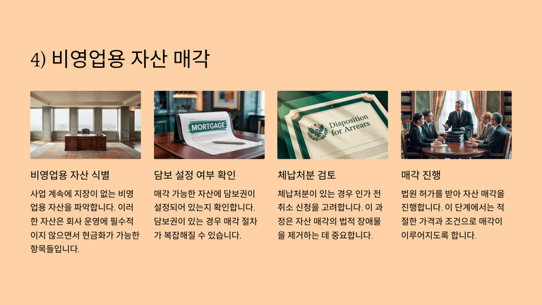 또한 비영업용 자산 매각은 현실적인 자금조달 수단이 될 수 있다. 담보가 설정되지 않은 기계설비나 차량, 부동산을 매각하여 자금을 확보할 수 있으나, 영업에 필요한 자산은 가급적 제외해야 하며 매각으로 인해 생산능력이 저하되지 않도록 유의해야 한다. 만약 자산에 체납처분이 걸려 있고 매각대금으로 조세를 변제할 수 없을 것이 예상되면, 인가 전 반드시 체납처분 취소 절차를 거쳐야 한다.