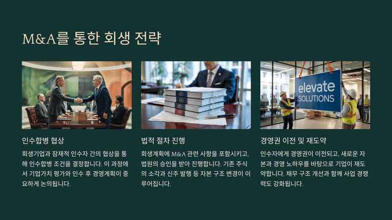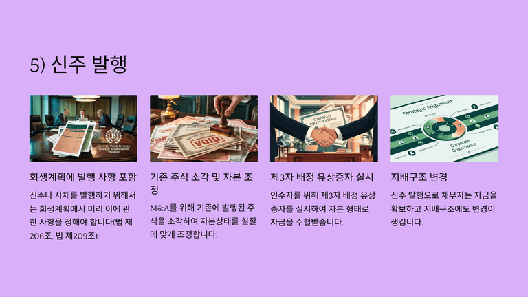 끝으로 신주나 사채 발행을 통한 자본조달은 회생계획에서 사전에 규정되어야 하며, 실제로는 M&A 과정에서 제3자 배정 유상증자의 형태로 자주 활용된다. 이는 단순한 자금조달을 넘어 기업의 지배구조 변화로 이어지며, 회생계획 수행의 중요한 수단이 된다. 따라서 채무자가 신주 또는 사채 발행을 고려하는 경우 회생계획 작성 단계에서 이를 반드시 반영해야 한다.