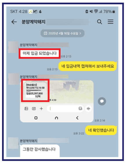 결국 소송이 진행되는 과정에서 시행사가 부담을 느끼게 되었고, 의뢰인의 분양계약을 해지하며 납입한 2,500만 원 전액을 반환하겠다는 의사를 밝혔습니다. 이에 따라 의뢰인은 2025년 4월 16일자로 기납입금 2,500만 원을 모두 돌려받으며 사건을 성공적으로 마무리하였습니다.