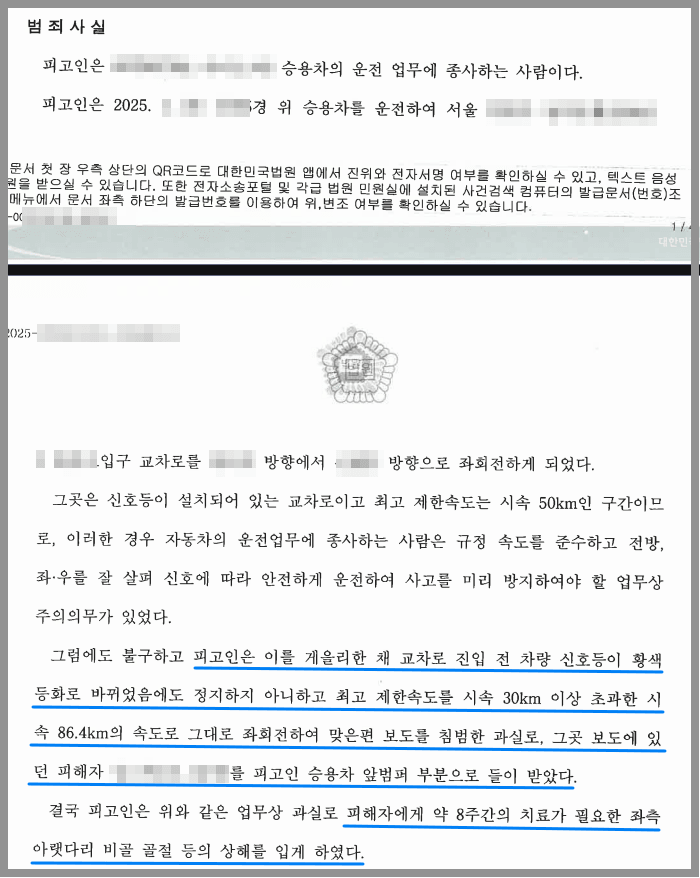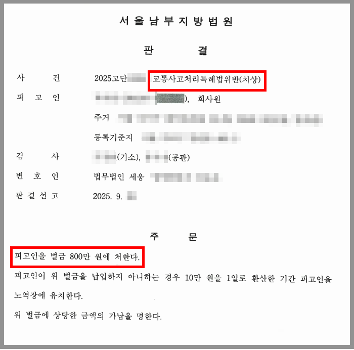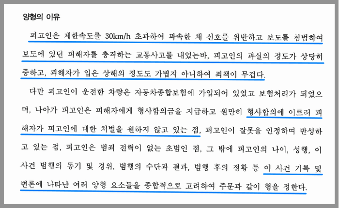 재판부에서는 과속과 신호위반을 한 J의 과실이 중하고 피해자의 상해도 가볍지 않다는 점을 지적하면서도 피해자와 원만히 합의가 이루어진 점을 비롯하여 변호인이 주장한 여러 유리한 양형 요소를 고려하여 벌금형을 선고하였습니다.