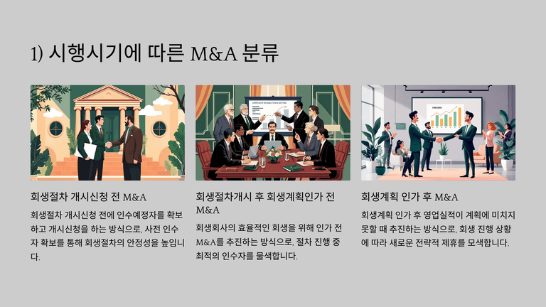 회생절차에서의 M&A는 시행 시기에 따라 크게 세 단계로 구분된다. 첫째, 회생절차 개시신청 전 M&A는 인수예정자를 미리 확보하고 개시신청을 하여 채무자의 신용하락에 따른 사업 훼손을 방지하고 부채 탕감을 목적으로 한다. 특히 스토킹 호스(Stalking-horse bid) 방식과 결합될 경우 조기 종결이 가능하며, 우선협상대상자가 사전에 조건을 협의한 대로 인수자가 되는 경우가 많다.