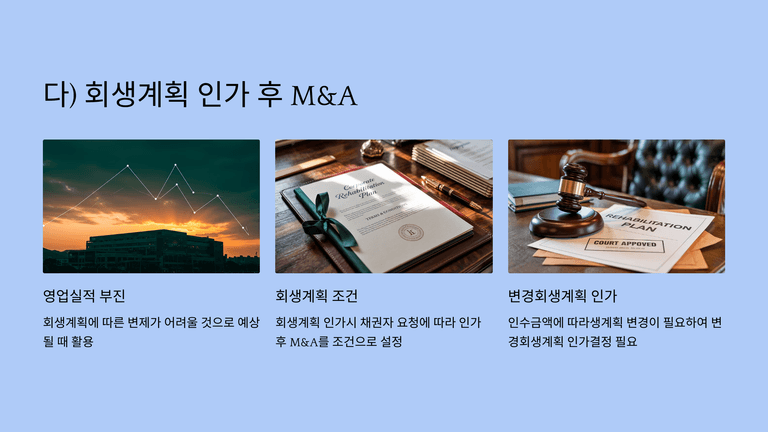 셋째, 회생계획 인가 후 M&A는 인가 후에도 영업 실적이 부진하거나 채권자의 요청에 따라 인가 조건으로 M&A를 진행하는 경우다. 다만 인수금액에 따라 변제계획 변경이 필요해 보통 변경회생계획안을 작성하여 인가를 다시 받아야 한다. 그러나 이러한 방식은 최근에는 인가 전 M&A에 비해 활용 빈도가 줄어드는 추세이다.