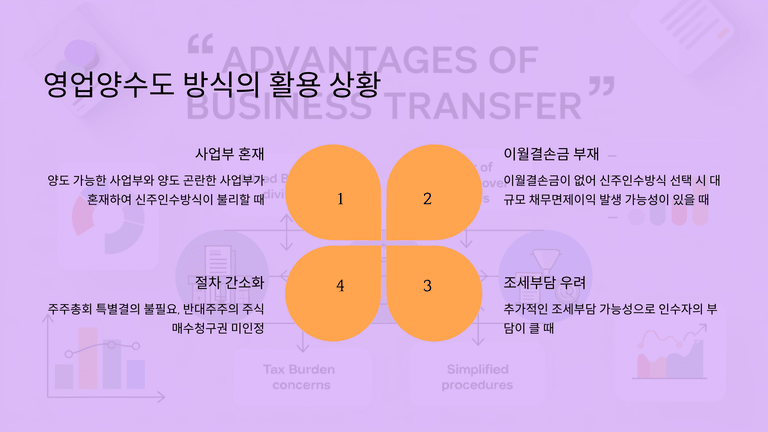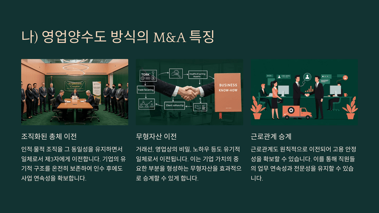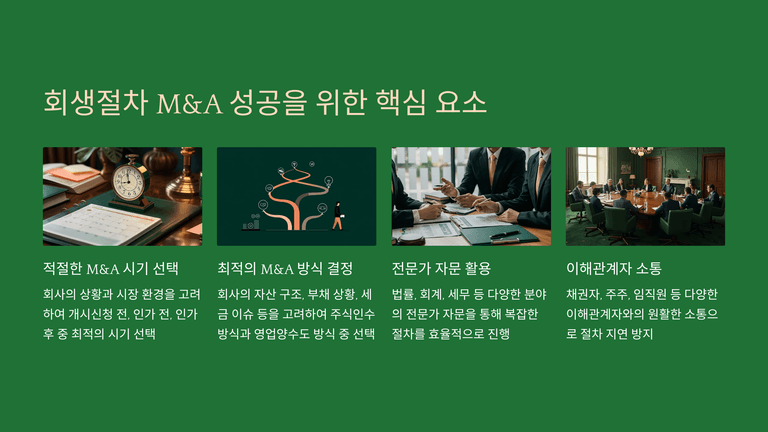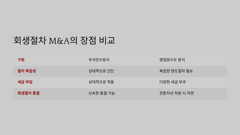 한편, M&A의 방법은 크게 주식인수방식과 영업양수도방식으로 구분된다. 제3자 배정 유상증자를 통한 신주 인수방식은 새로운 책임경영주를 확보하고 조기에 회생절차에서 벗어나도록 하는 장점이 있으며, 회생절차에서는 주주총회 특별결의나 채권자보호절차 없이 감자가 가능해 구조조정이 신속하다. 반면, 영업양수도 방식은 영업 전부 또는 일부를 일체로 이전하는 방법으로, 노하우와 근로관계까지 승계되지만 양도 절차가 복잡하고 세금 부담이 크다는 단점이 있다.
