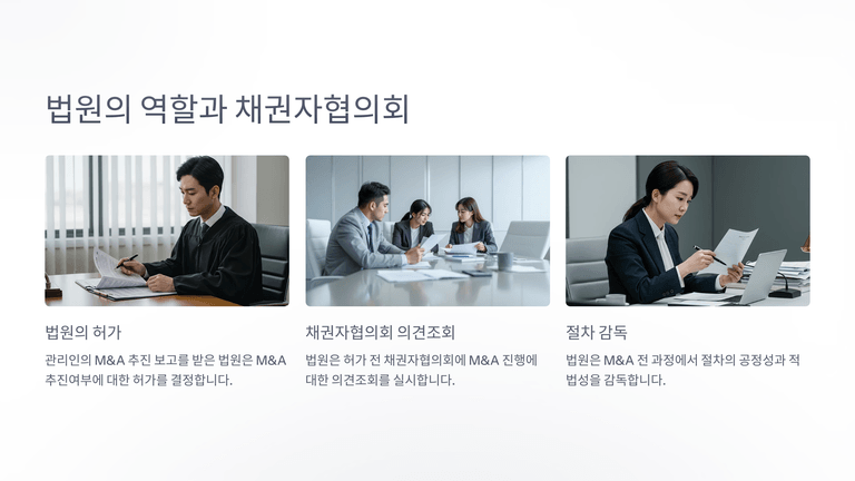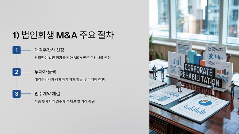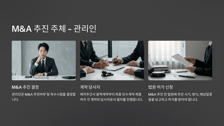 법인회생에서의 M&A 절차는 관리인이 주체가 되어 진행하는 것이 특징이다. 관리인은 M&A 추진 여부와 시기를 결정하고, 매각주간사 용역계약 체결부터 최종 인수계약 체결까지 직접 당사자가 되어 절차를 수행한다. 다만 추진에 앞서 법원에 계획을 보고하고 허가를 받아야 하며, 법원은 채권자협의회의 의견을 조회한 뒤 허가 여부를 결정한다.