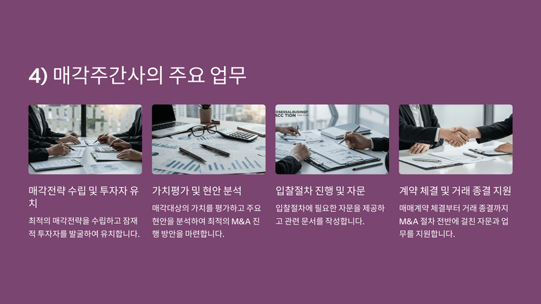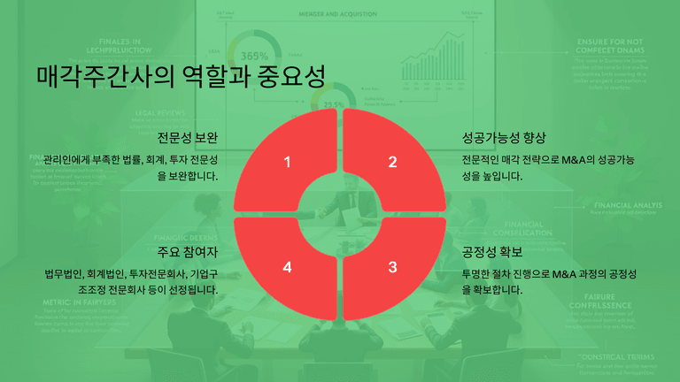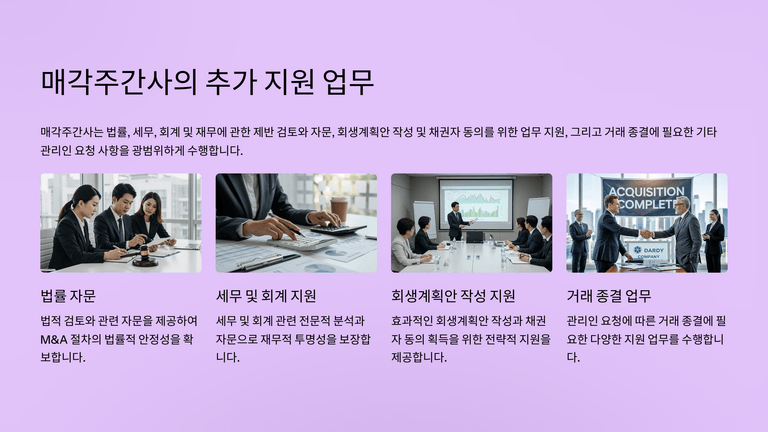 선정된 매각주간사는 매각전략 수립, 가치평가, 현안분석, 입찰자문, 매각공고와 계약 체결 지원 등 M&A 절차 전반을 담당한다. 또한 법률·세무·회계·재무 검토, 회생계획 작성 지원, 채권자 동의 확보 등 광범위한 업무를 수행하게 된다. 이로써 M&A는 법원의 감독, 채권자협의회 의견, 관리인의 주도, 매각주간사의 전문성이 결합된 회생기업 정상화의 핵심 절차라고 할 수 있다.