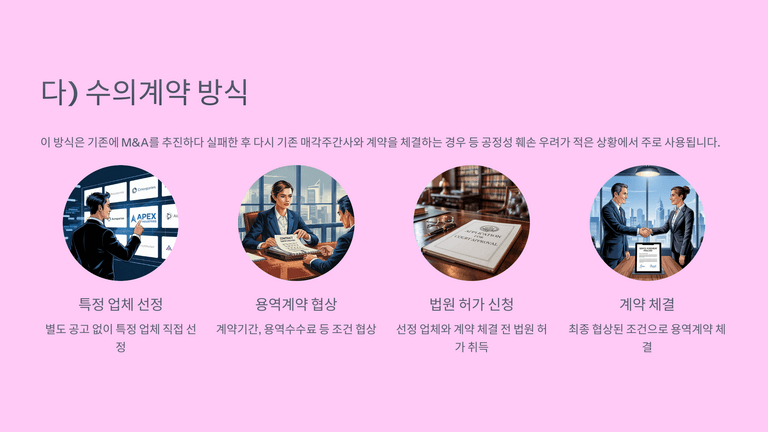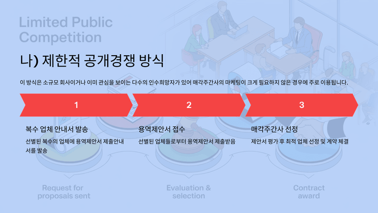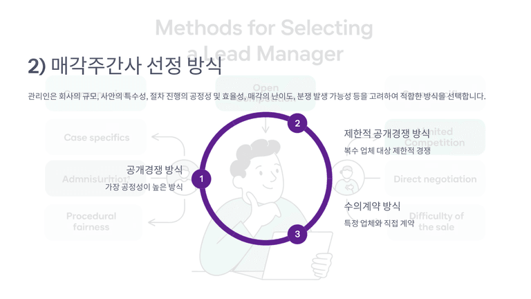 매각주간사 선정은 절차의 핵심 단계라고 할 수 있다. 관리인은 회사의 규모, 특수성, 이해관계자 수, 마케팅 필요성 등을 고려하여 공개경쟁 방식, 제한적 공개경쟁 방식, 수의계약 방식 중 하나를 선택할 수 있다. 공개경쟁 방식은 대규모 기업 등 공정성이 중요한 경우 사용되고, 제한적 공개경쟁 방식은 소규모 기업이나 이미 인수희망자가 존재하는 경우에 적합하다. 수의계약 방식은 실패한 절차 이후나 긴급한 상황에서 활용될 수 있다.