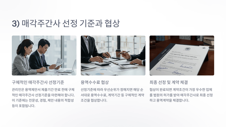 매각주간사 선정 과정에서도 공정성이 요구된다. 관리인은 복수의 제안서가 제출될 가능성을 고려해 구체적인 선정기준을 마련해야 하며, 이후 용역수수료, 계약기간 등 조건을 협상할 수 있다. 조건 협상 후 가장 우수한 업체를 선정하고 법원의 허가를 받아 계약을 체결하는 것이 원칙이다.
