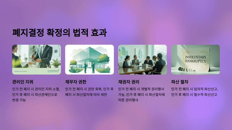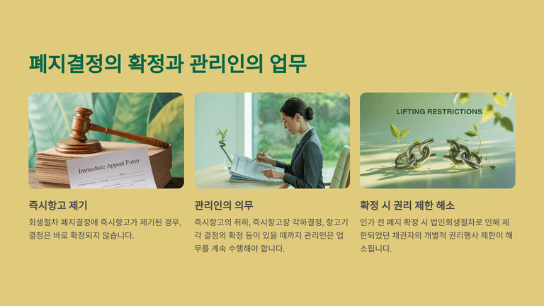 법인회생절차의 폐지는 인가 전 폐지와 인가 후 폐지로 구분되며, 폐지결정이 확정되어야 회생절차가 종료된다. 즉시항고가 제기된 경우에는 취하나 기각 확정 전까지 관리인이 업무를 수행한다. 인가 전 폐지 확정 시 관리인의 권한은 소멸하고 채무자의 권한이 회복되며 채권자들의 개별적 권리행사가 가능해진다. 반면 인가 후 폐지가 확정되면 법원이 직권으로 파산을 선고하여 청산절차로 이행된다.