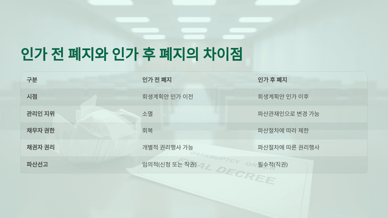 결국 인가 전 폐지 시에는 파산 사유가 있으면 신청 또는 직권으로 파산이 선고될 수 있고, 인가 후 폐지 시에는 파산 사유가 인정되면 법원이 반드시 직권으로 파산을 선고한다. 따라서 인가 전·후 폐지는 절차상 차이가 있으며, 인가 후 폐지는 파산으로의 이행이 필수적이라는 점에서 보다 엄격하게 작용한다.