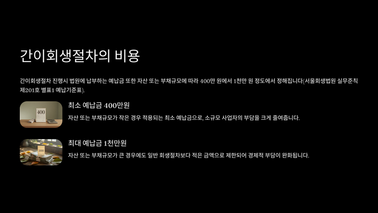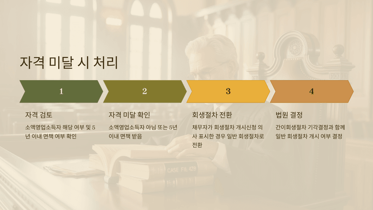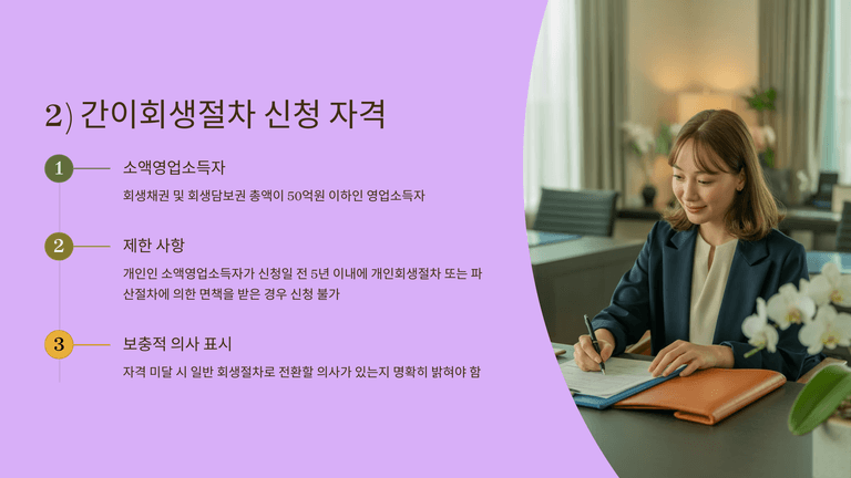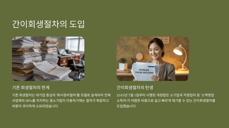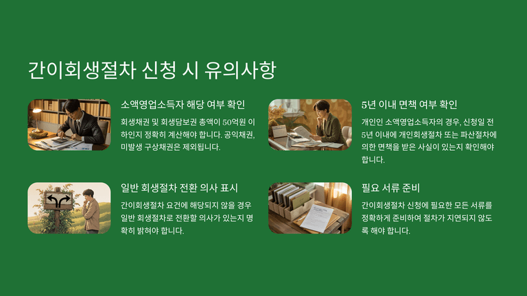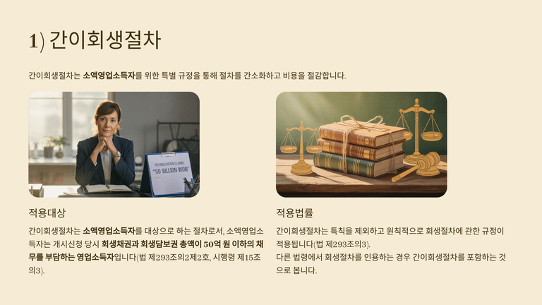 간이회생절차는 기존 회생절차가 대기업 중심으로 설계되어 중소기업과 자영업자에게는 복잡성과 비용이 과도하다는 지적을 반영하여 2015년 도입되었다. 이 제도는 ‘소액영업소득자’를 대상으로 하며, 회생채권과 회생담보권 총액이 50억 원 이하인 경우에만 신청할 수 있다. 개인 채무자가 최근 5년 내 개인회생이나 파산으로 면책을 받은 경우는 신청이 제한된다.