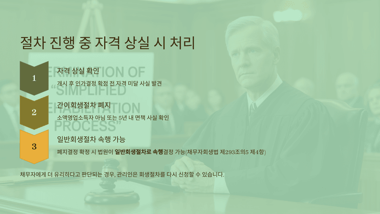 간이회생절차는 일반 회생절차 규정을 기본적으로 따르되 특칙을 두어 간소화된다. 채무자가 소액영업소득자 요건을 충족하지 못하거나 면책 경력이 있는 경우 법원은 간이회생을 폐지할 수 있으며, 필요 시 일반 회생절차로 전환하여 계속 진행할 수 있다. 신청 시점이나 절차 도중에 자격 요건이 충족되지 않으면 폐지 또는 전환이 이루어진다.
