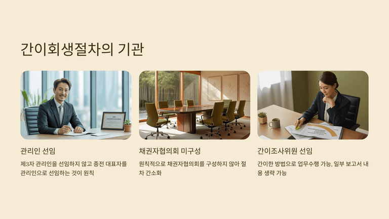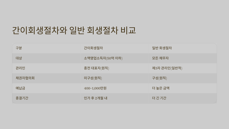 절차상 간이회생은 대표자를 관리인으로 선임하고, 원칙적으로 채권자협의회를 구성하지 않으며, 간이조사위원을 두어 업무를 축소·단순화한다. 심문과 조사, 각종 서류 제출 기한은 법정 최소기간으로 단축되고, 관계인집회도 요지 통지로 갈음할 수 있다. 또한 예납금은 400만 원에서 1천만 원 수준으로, 일반 회생절차에 비해 낮게 책정된다.