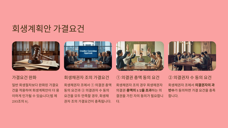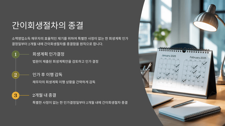 가결 요건도 완화되어 회생채권자조에서 과반수 의결권자와 총액 절반 이상의 동의를 얻으면 가결로 인정된다. 법원은 특별한 사정이 없는 한 인가결정일로부터 2개월 내에 절차를 종결하는 것을 원칙으로 하여, 소액영업소득자가 신속하고 저렴하게 시장에 복귀할 수 있도록 제도를 운용한다.