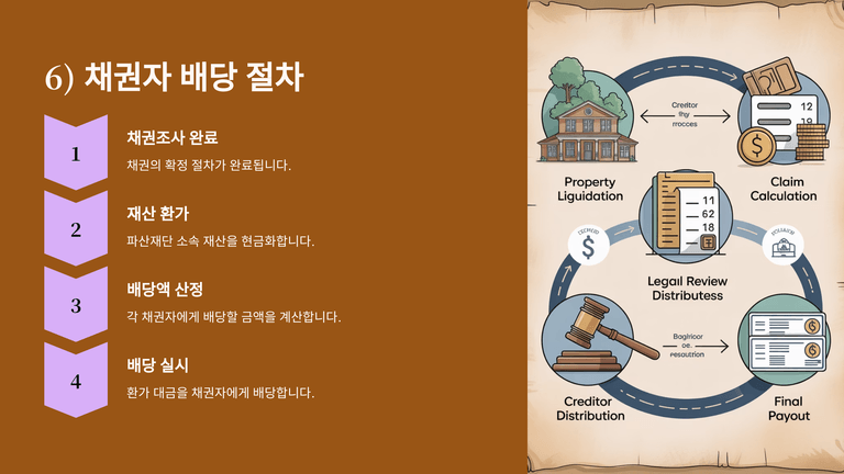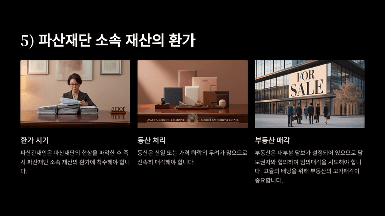 파산관재인은 파산재단의 현황을 파악한 후 즉시 재산의 환가에 착수한다. 환가는 일반적으로 임의매각의 방식으로 이루어지며, 동산은 산일이나 가격 하락의 우려가 크므로 신속히 매각하고, 부동산은 담보권자와 협의하여 임의매각을 시도한다. 환가와 채권조사가 완료되면 파산관재인은 환가대금을 기준으로 법정 순위에 따라 채권자에게 배당을 실시한다.